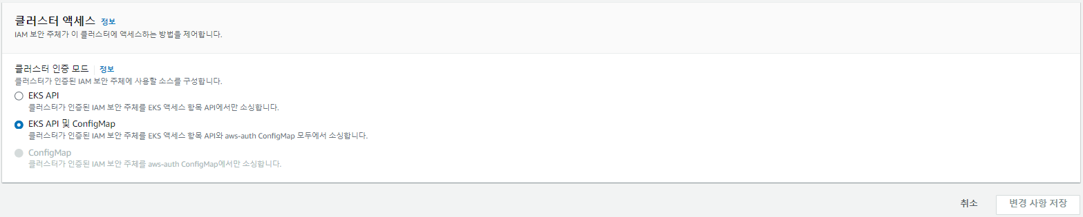 ConfigMap을 이용한 액세스 관리가 아닌 EKS API를 이용할 것이므로 EKS API 및 ConfigMap을 선택한다.