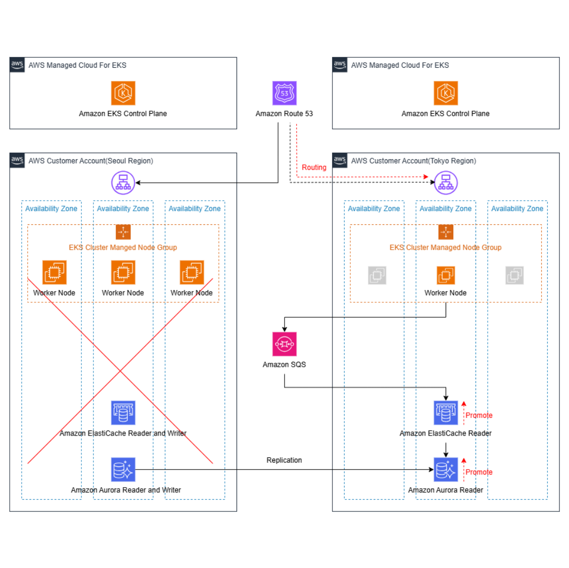 재해(Disaster)의 발생 후 성공적인 복구를 위해서 재해 상황의 인지(Detect), 복구 리전에서 인프라의 복원 및 확장(Restore), 그리고 복구 리전으로 트래픽을 전달하기 위한 장애 조치(Failover)의 과정이 필요하다.