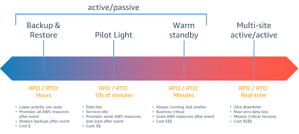 재해 복구(Disaster Recovery) 전략은 시스템이 재해 상황에서도 안정적이고 지속적으로 운영될 수 있도록 준비하는 방안을 말하며 각 전략은 비용, 복구 소요 시간 , 데이터 손실 허용 범위 등의 요소에 따라 적절한 상황에서 사용된다.